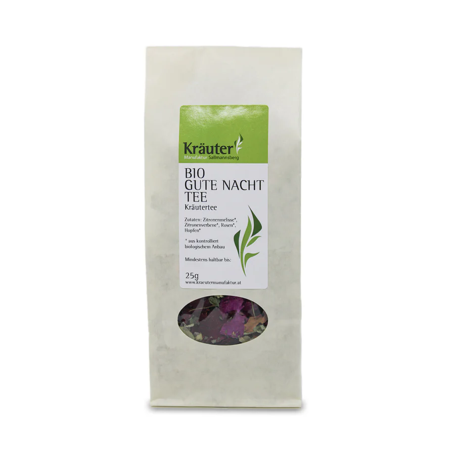 Gleite am Abend sanft ins Land der inneren Ruhe. Diese harmonische Bio Kräuterteemischung unterstützt dein Nervensystem beim Abschalten und begleitet dich sanft in einen erholsamen Schlaf.